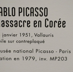 L’exposition se termine par le Massacre en Corée. On peut y discerner la dénonciation des crimes de guerre à l’encontre des civils, qui sont autant de crimes contre l’humanité commis au nom d’une idéologie, qui balaye l’espoir de renaissance d’un peuple, en assassinant les enfants et les femmes porteuses de la vie, qui constituent son avenir.