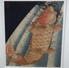 L’écrin des chefs-d’œuvre : la dernière salle est conçue comme un écrin pour les chefs-d’œuvre de l’estampe japonaise. Les estampes de cette dernière salle, extrêmement rares et fragiles, ne peuvent être exposées qu’un certain nombre de jours par an. Les trois œuvres sont présentées en rotation dans cette section : nous ne verrons ni l’Envers de la vague, ni Pluie fine au sommet du mont Fuji d’ Hokusai qui nous auraient permis de découvrir le magnifique Bleu de Prusse prisé par les Hollandais. Nous découvrons un chef-d’oeuvre d’Hiroshige : Averse soudaine sur le pont Shin-Ohashi et Atake de la Série Cent Vues célèbres d’Edo, 1857.