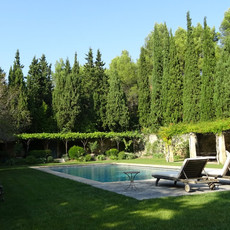 Pour atteindre le domaine de Pierredon, presque aussi occulte que celui des « Terres de Pierre » , il faut emprunter un très très long chemin caillouteux au début duquel le nom du domaine figure sur une pierre peu visible . Après de faux espoirs pour entrer dans la propriété protégée par des barrières et des chaînes, on arrive enfin à un bâtiment très moderne devancé par de grandes sculptures contemporaines . Nous commençons par la dégustation de vins bios ayant récemment obtenu la qualification AOP côteaux d'Aix : cépages traditionnels : cinsault, syrah, Grenache, Cabernet , Sauvignon : nous goûtons trois blancs , deux rosés et deux rouges , le dernier étant un merlot . Le nom des cuvées figurant sur les étiquettes des bouteilles s'inspire des moines chalaisiens et reprend des moments de leur journée : Prima Luce, Ultima Laude, Vespro.Le maître de chai nous montre rapidement les cuves en inox sans trop d'explications et nous apercevons les barriques encore très récentes avant de nous diriger vers l'abbaye : visiblement les visites sont exceptionnelles et nous ne pouvions pas nous attarder , les propriétaires venus d'Italie étant sur les lieux . Un peu plus bas, au bout d'une belle allée de platanes, entourée d'un champ d'amandiers d'un côté et d'oliviers de l'autre, nous découvrons l'abbaye construite par les moines chalaisiens entre le XIe et la fin du XIIe siècle .Elle possède un seul clocher .Entièrement rénovée , nous tournons autour sans pouvoir y pénétrer car elle a été transformée en lieu d'habitation par le cabinet La Fourcade . La bastide en prolongement de l'abbaye donne sur un parc arboré avec une belle perspective sur les Alpilles .. Les bassins, la piscine témoignent de la présence d'une source .. Nous rentrons dans l'intimité des propriétaires en poussant quelques portillons ouvrant sur l'espace destiné aux enfants, puis nous découvrons le potager avant de regagner nos voitures, conscients d'avoir eu le privilège de visiter ce lieu très protégé .