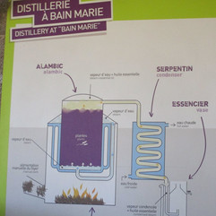 Le procédé d'extraction "au bain marie" est traditionnel, il est combiné en fin de transformation avec le principe du vase florentin pour recueillir l'huile, en contrebas.... Beaucoup de déchets pour très peu d'huile.. 130 kg de plantes en moyenne pour obtenir un litre d'huile.... qui donc coûte fort cher....le minable bidon bleu -sur la photo-, qui contient de l'huile d'Hélichryse (immortelle) vaut un petite fortune puisque chaque litre contenu "vaut" la bagatelle d'environ 11 600€ !!!!